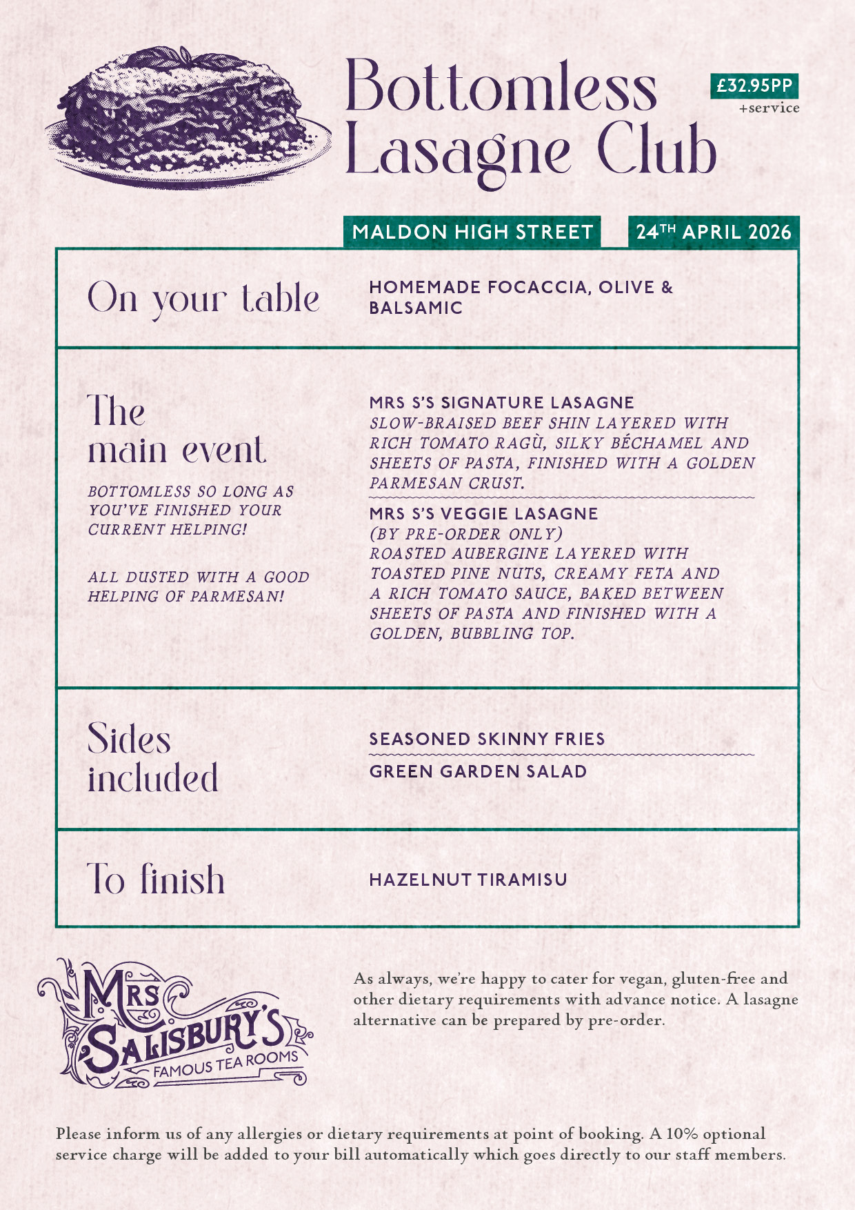 Join us on 24th April for a comforting evening of proper, homemade lasagne at Mrs Salisbury’s. Start with focaccia, olives and balsamic, then enjoy our signature slow-braised beef lasagne — with bottomless helpings as long as you finish your plate.