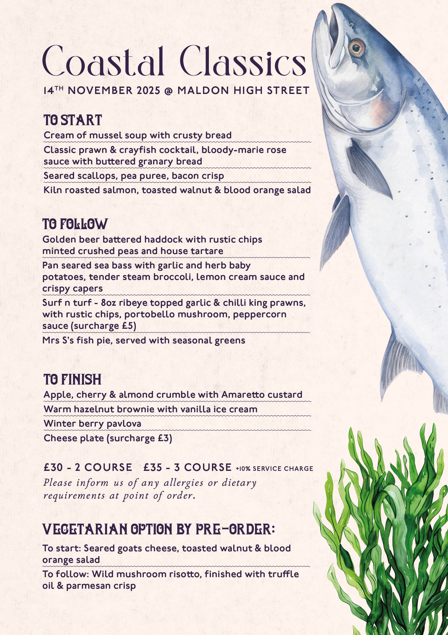 Join us on Friday 14th November 2025 for an unforgettable three-course celebration of seaside favourites, featuring fresh seafood and coastal-inspired dishes.
