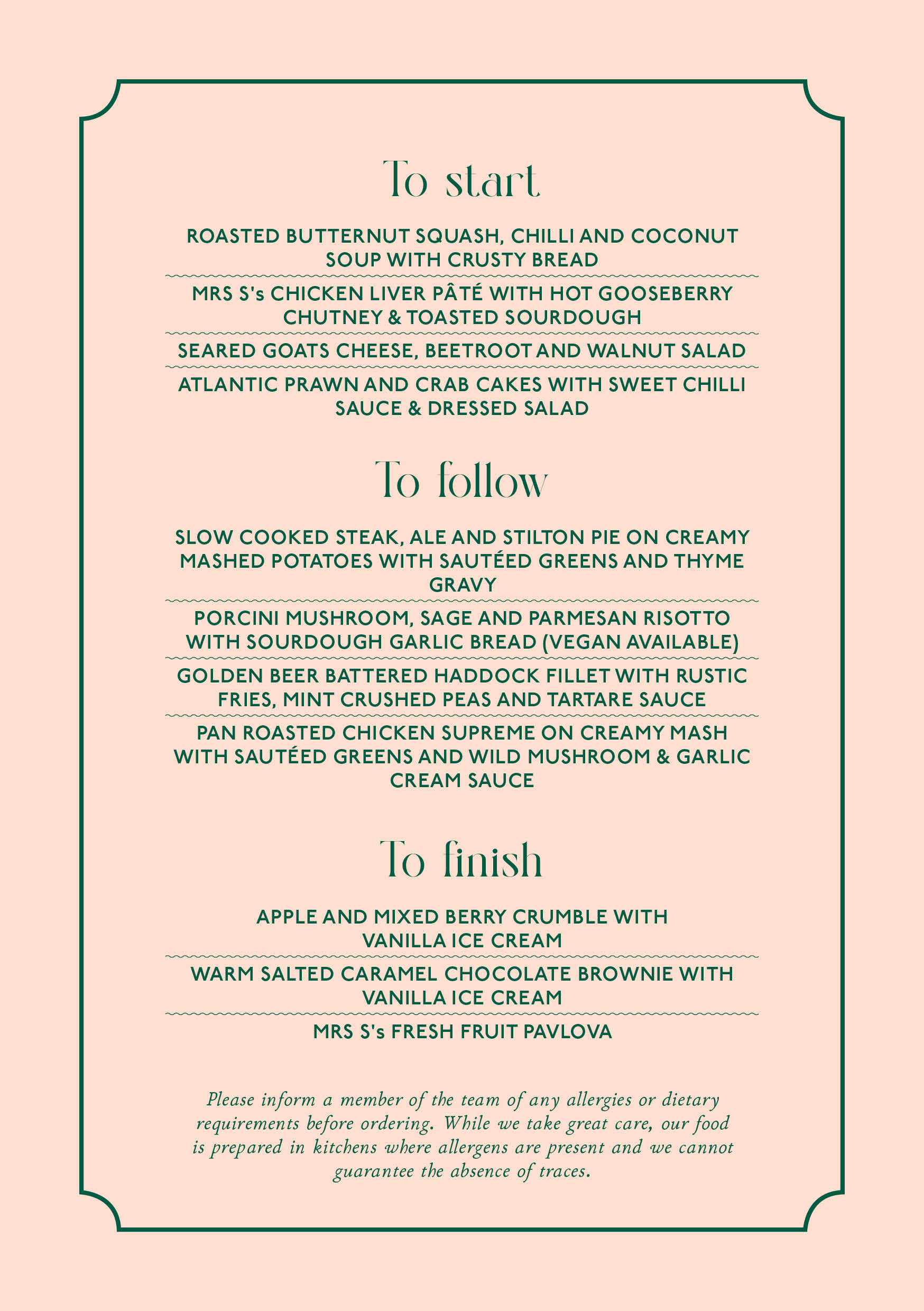We are more than happy to cater for other dietary requirements such as vegan and gluten free. Please get in touch before booking so our chef may provide some special options.