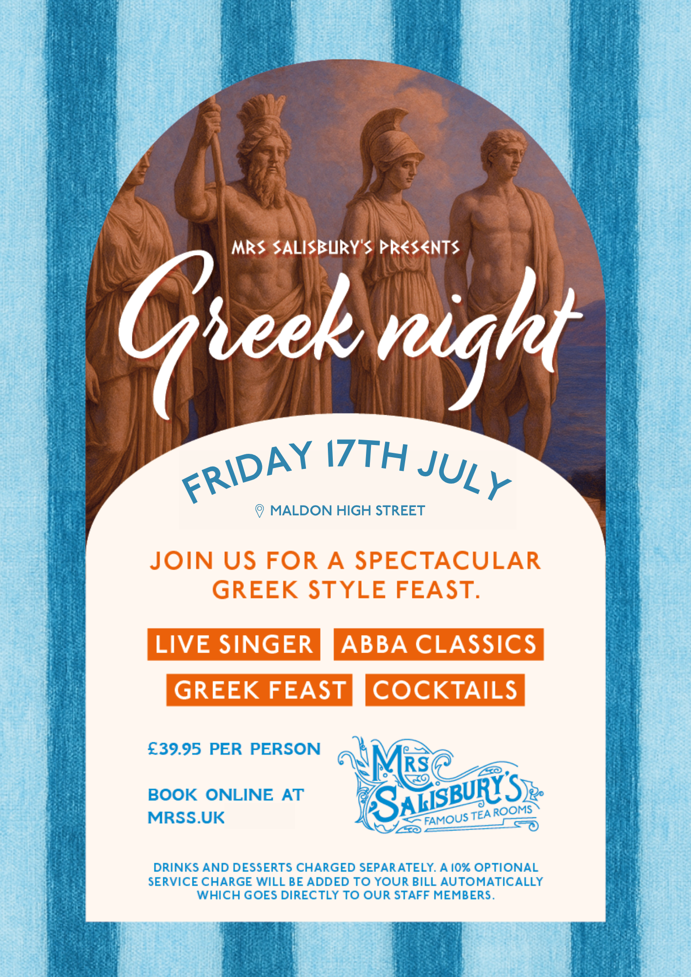 A spectacular feast of delicious greek inspired food with a live singer performing iconic ABBA classics & more. Dancing is highly encouraged and cocktails & desserts will be available on the night!