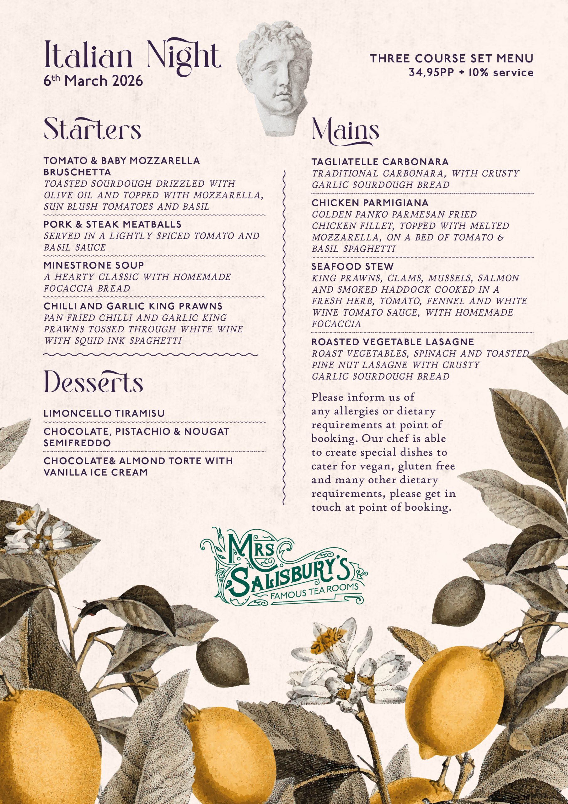 Join us for a cozy evening of Italian flavours, delicious pasta, fine wine, and indulgent desserts. 🍝🥂