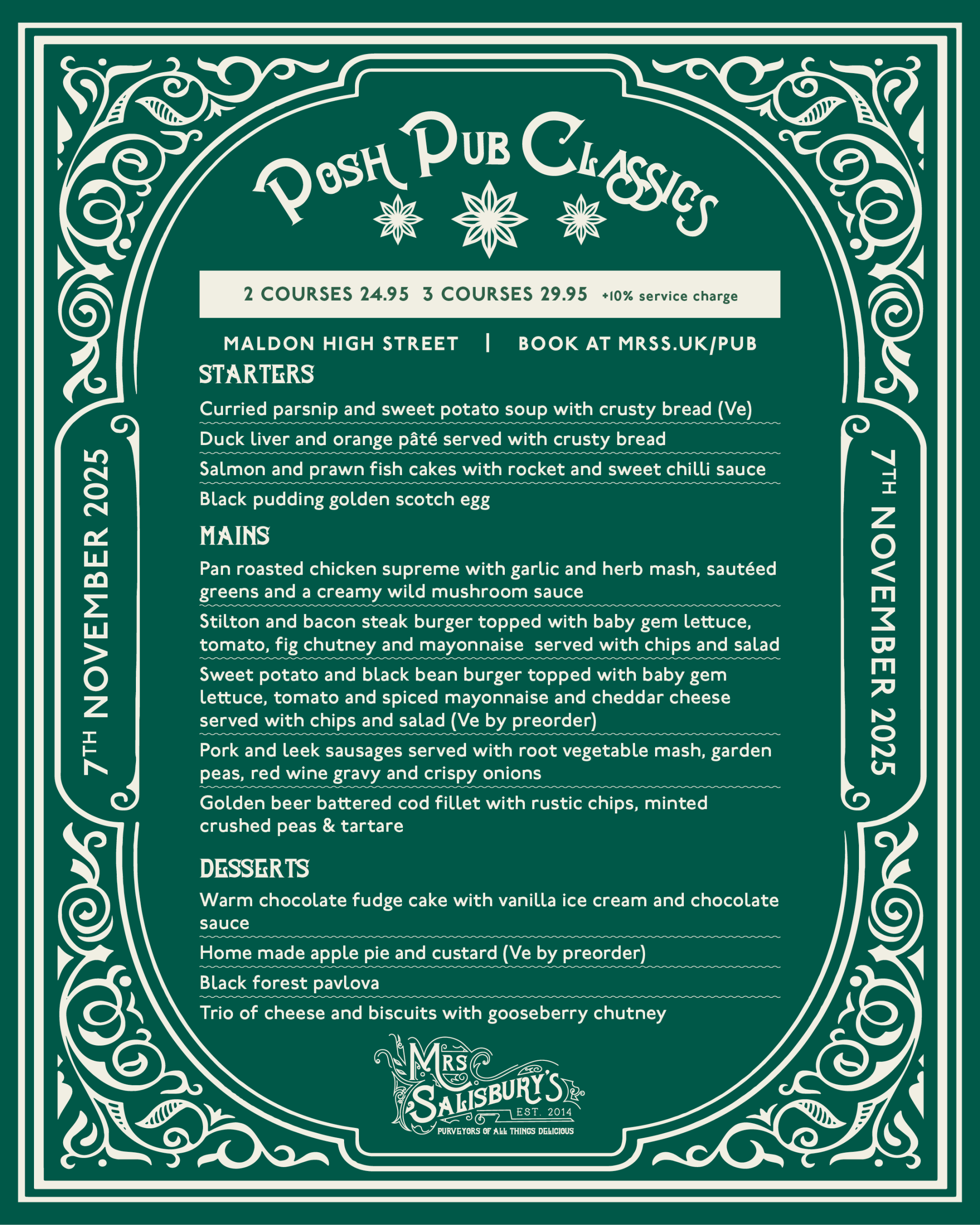 Join us for a casual evening featuring a three-course à la carte menu with our take on pub classics like Fish and Chips. Save the date for Friday 7th November, at our Maldon High Street location – reservations required.