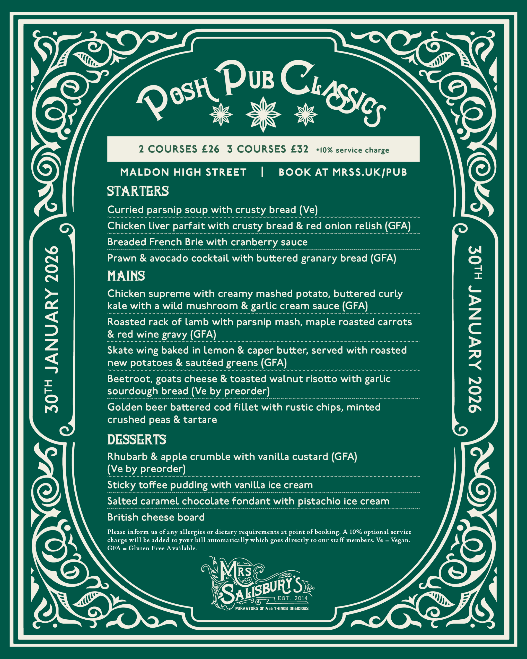 Join us for a casual evening featuring a three-course à la carte menu with our take on pub classics like Fish and Chips. Save the date for Friday 30th January, at our Maldon High Street location – reservations required.