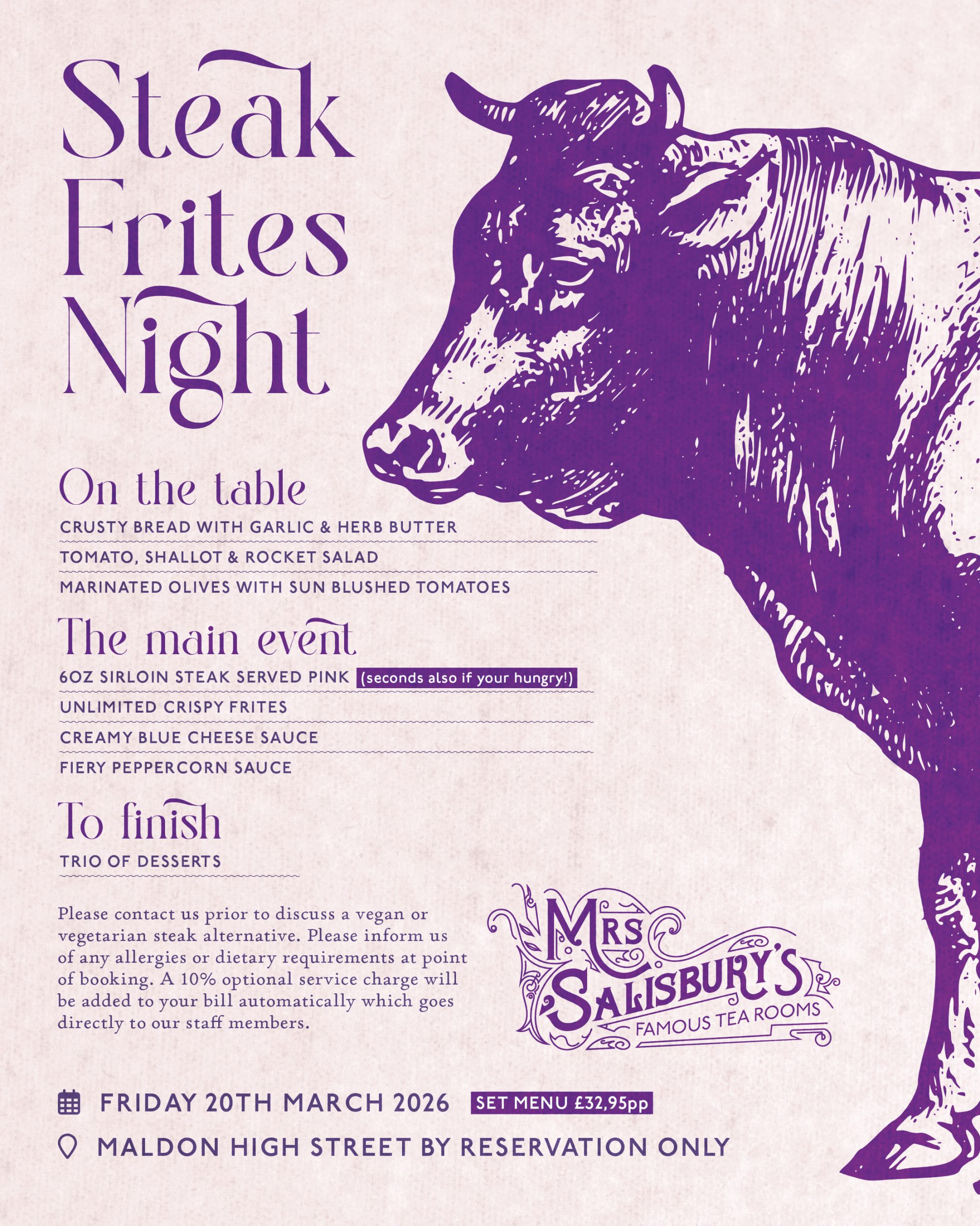 Join us in our Maldon Location on Friday 20th March for a sizzling hot night! Enjoy a 6oz sirloin steak served pink (seconds available if you’re hungry) with unlimited French fries & sauces to melt your heart.