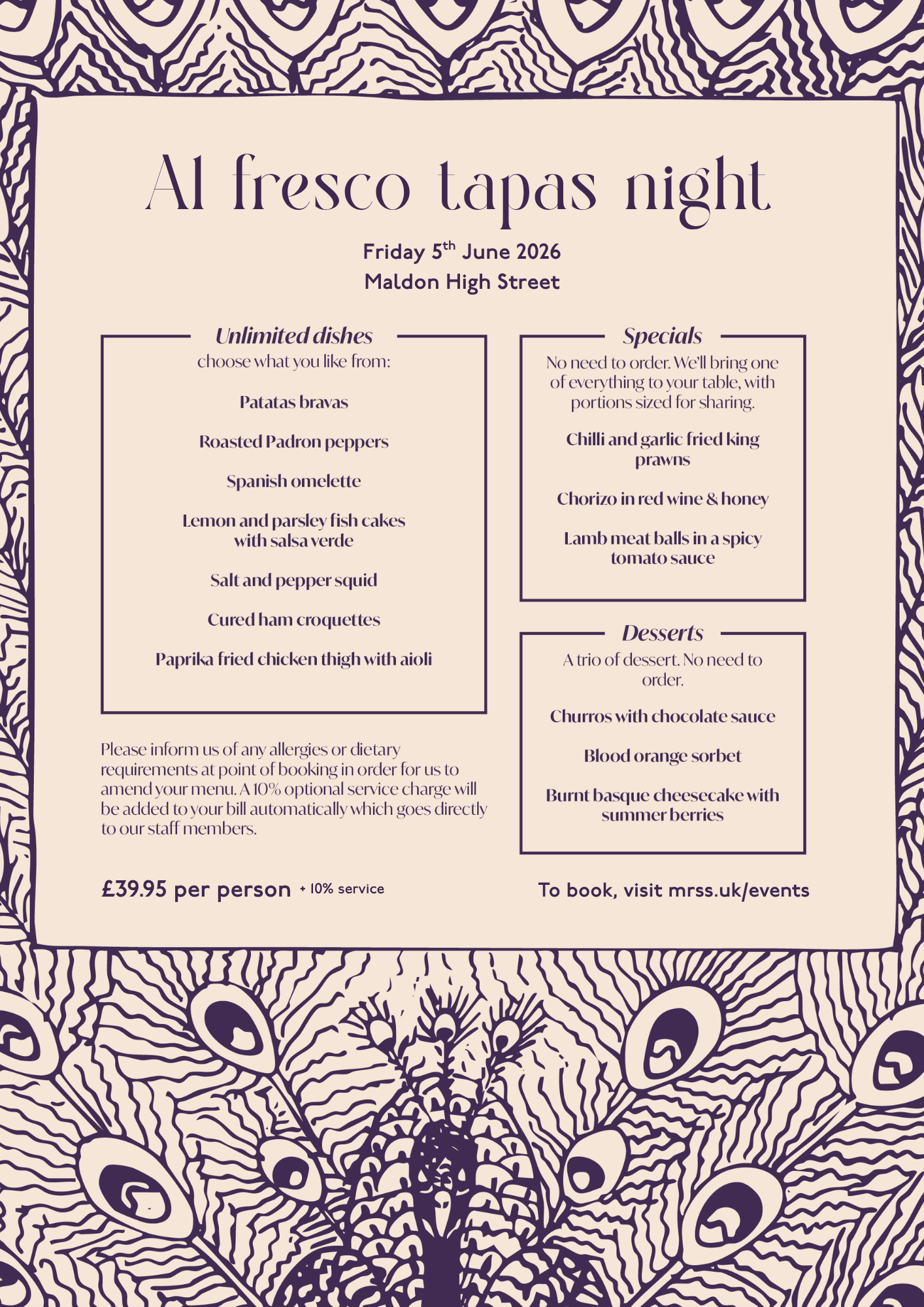 Join us for a relaxed and vibrant evening of Spanish-inspired small plates served al fresco. Pair your meal with a variety of cocktails, beer or wines from our fully stocked bar.